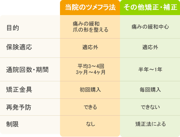 装着直後から『痛くない!』と驚かれる方が多い矯正力の高いツメフラ法で根本改善を目指しています。